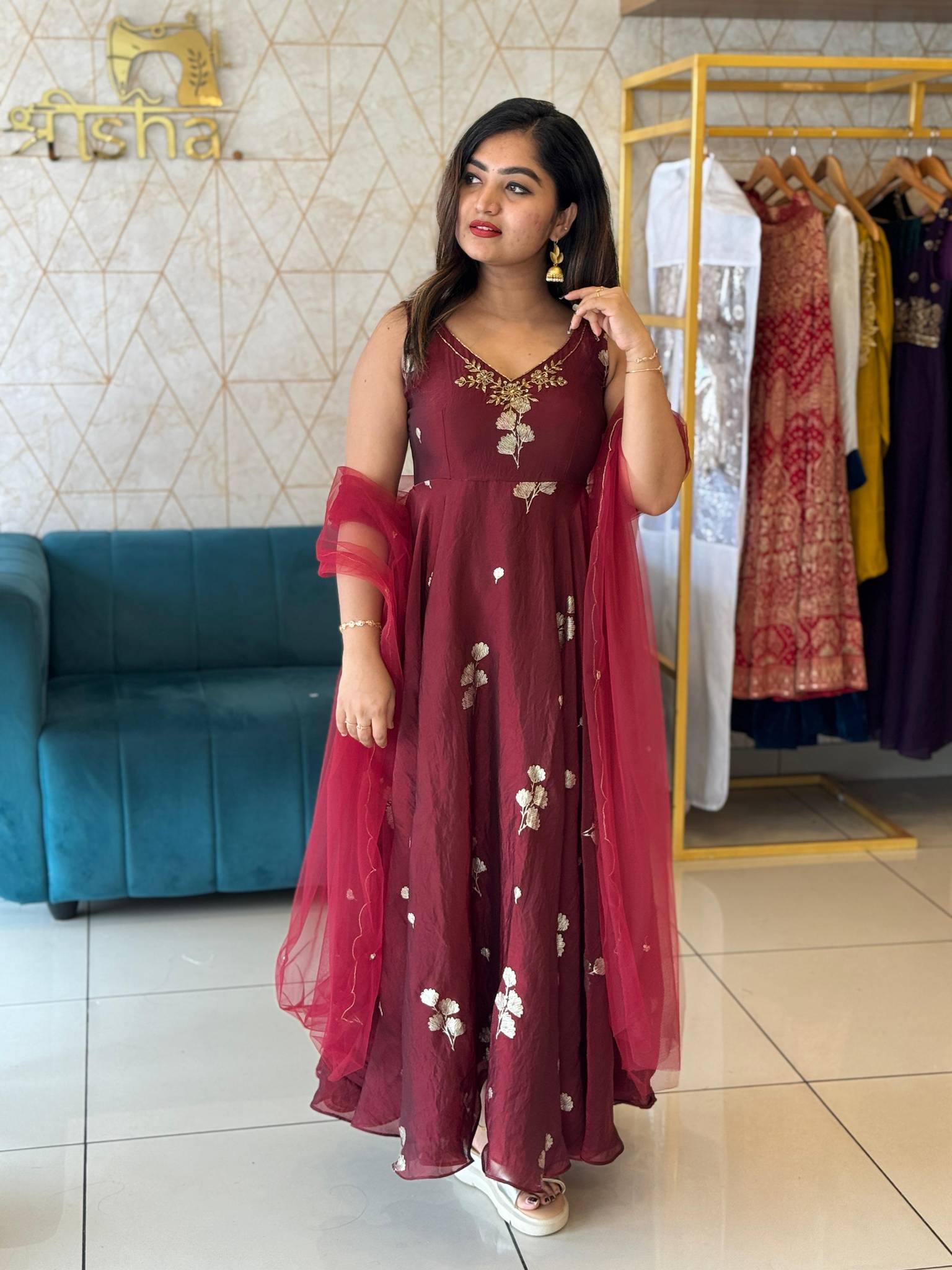 Elevate your wardrobe with our stunning Anarkali set featuring an umbrella top and matching dupatta, crafted from exquisite velvet organza. This elegant ensemble is designed with attachable sleeves, allowing for versatility and comfort, while the inner lining adds an extra touch of sophistication.